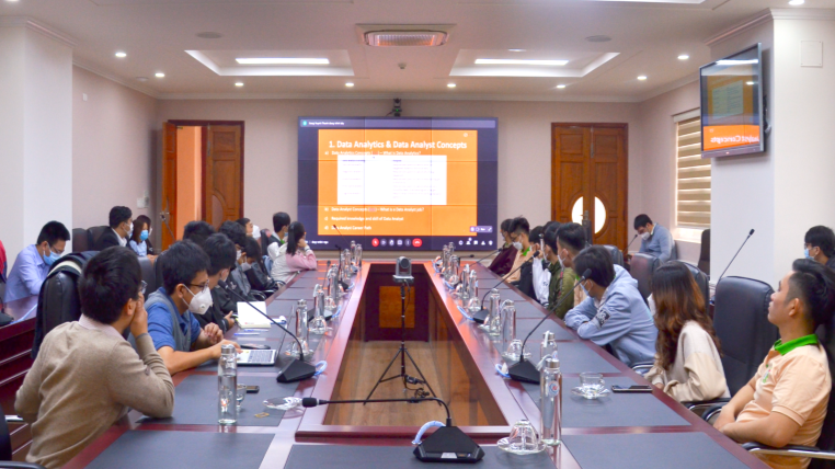 Trong khuôn khổ chương trình, các thành viên tham dự lắng nghe bài diễn thuyết với chủ đề “An overview of data analytic process and real-life applications” (Tổng quan về quá trình phân tích dữ liệu và các ứng dụng trong thực tế) của chuyên gia Huỳnh Thanh Sang. Qua bài diễn thuyết, chuyên gia Huỳnh Thanh Sang đã chia sẻ đầy đủ các mô hình phân tích dữ liệu, một số vấn đề về lĩnh vực khoa học dữ liệu trong doanh nghiệp, giúp sinh viên hình dung được các bước cơ bản của việc thu thập, xử lý dữ liệu trong thực tế.