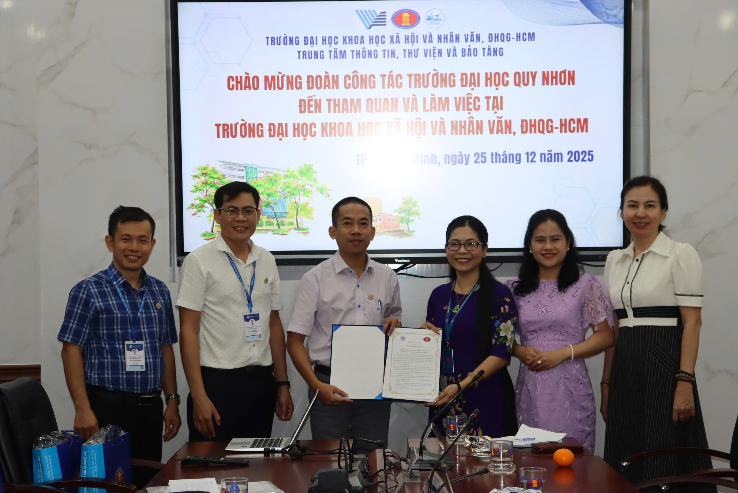 (IUC) – Chiều 25/12/2025, đoàn công tác Trường do Tiến sĩ Nguyễn Thanh Bình, Chủ nhiệm Dự án số 6 (SP6) thuộc Chương trình IUC-QNU do tổ chức VLIR-UOS (Vương quốc Bỉ) tài trợ, đã có buổi làm việc tại Trường Đại học Khoa học xã hội và Nhân Văn, Đại học Quốc Gia Thành phố Hồ Chí Minh (USSH). Buổi làm việc tập trung trao đổi chuyên sâu về thư viện, công nghệ thông tin, e-learning và chuyển đổi số trong giáo dục đại học.