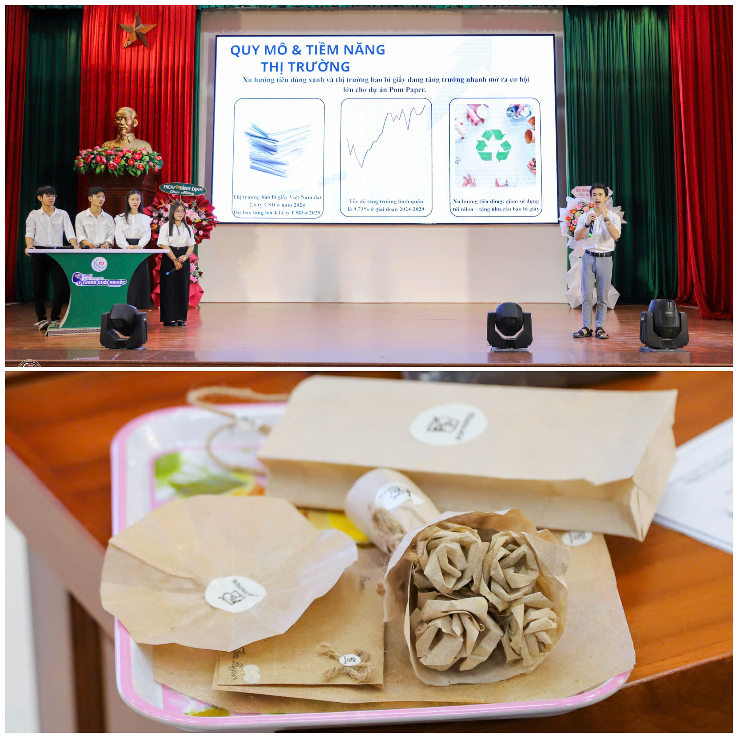 02 Giải Nhì thuộc về dự án Pom Paper - Giấy sinh học từ vỏ bưởi (nhóm sinh viên đến từ Khoa Công nghệ thông tin) và dự án Smart Financial Board Game - Giúp trẻ 6-10 tuổi nhận thức tài chính cá nhân (nhóm sinh viên đến từ Khoa Tài chính - Ngân hàng & Quản trị kinh doanh); 02 giải Ba được trao cho dự án NabaTek CyberShield (nhóm sinh viên đến từ Khoa Công nghệ thông tin) và dự án BIO-PILL FOR URBAN PLANTS: Giải Pháp Xanh Cho Cuộc Sống Đô Thị Hiện Đại (nhóm sinh viên đến từ Khoa GDTH & Mầm non). Ngoài ra, Ban Tổ chức cũng trao 05 giải Khuyến khích cho các dự án có ý tưởng tiềm năng và cách tiếp cận mới.