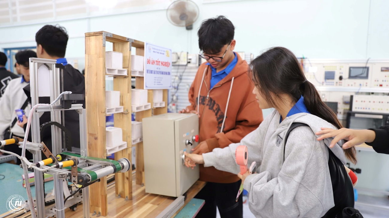 Các bạn học sinh tham quan các mô hình, đồ án tốt nghiệp do sinh viên QNU thực hiện