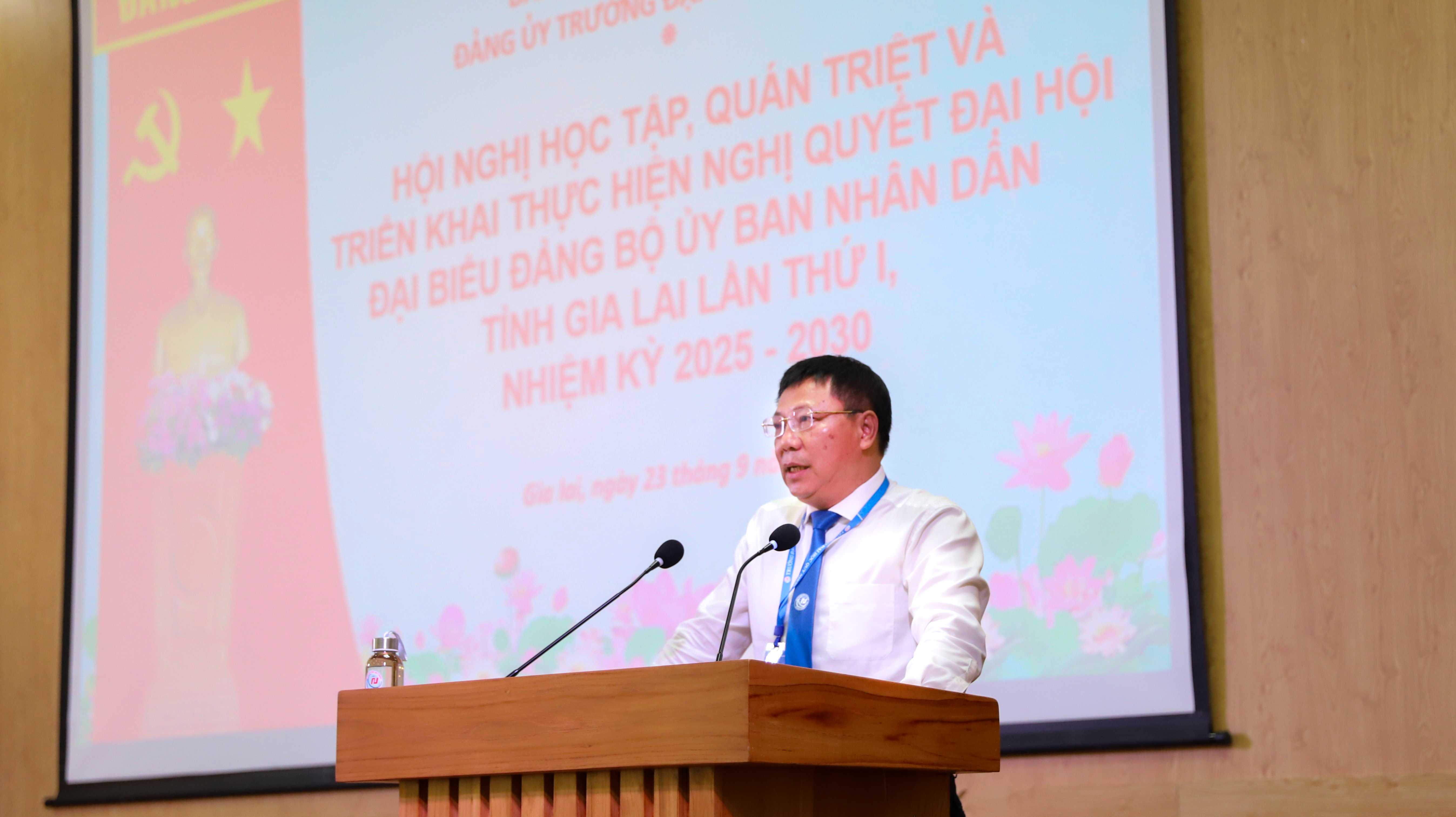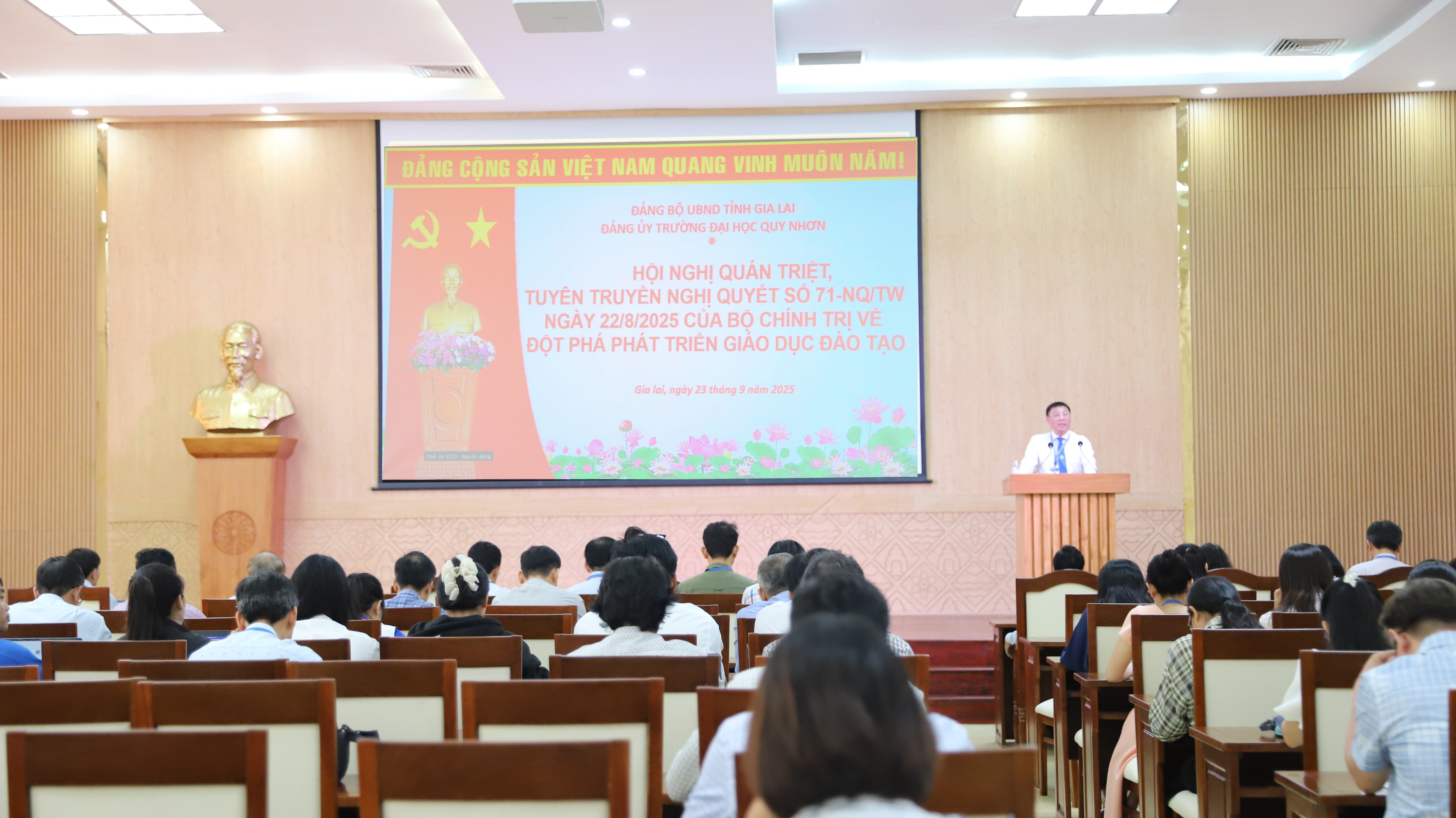 (ĐU) - Thực hiện Kế hoạch số 09-KH/ĐU ngày 09/9/2025 của Đảng ủy Ủy ban nhân dân tỉnh Gia Lai về tổ chức học tập, quán triệt và triển khai thực hiện Nghị quyết Đại hội đại biểu Đảng bộ Ủy ban nhân dân tỉnh Gia Lai lần thứ I, nhiệm kỳ 2025 - 2030 và Công văn số 244-CV/BTGDVTU ngày 09/9/2025 của Ban Tuyên giáo và Dân Vận Tỉnh ủy Gia Lai về triển khai quán triệt, tuyên truyền Nghị quyết số 71-NQ/TW của Bộ Chính trị, sáng ngày 23/9/2025, Đảng ủy Trường Đại học Quy Nhơn đã tổ chức Hội nghị học tập, quán triệt và triển khai thực hiện Nghị quyết Đại hội đại biểu Đảng bộ Ủy ban nhân dân tỉnh Gia Lai lần thứ I, nhiệm kỳ 2025 - 2030 và quán triệt, tuyên truyền Nghị quyết số 71-NQ/TW ngày 22/8/2025 của Bộ Chính trị về đột phá phát triển giáo dục và đào tạo cho gần 90 đồng chí là Ủy viên Ban Chấp hành Đảng bộ, cấp ủy các Chi bộ trực thuộc Đảng bộ, Ban Giám hiệu, Chủ tịch Công đoàn trường, Bí thư Đoàn trường, Chủ tịch Hội Sinh viên trường và Chủ tịch Hội cựu chiến binh.