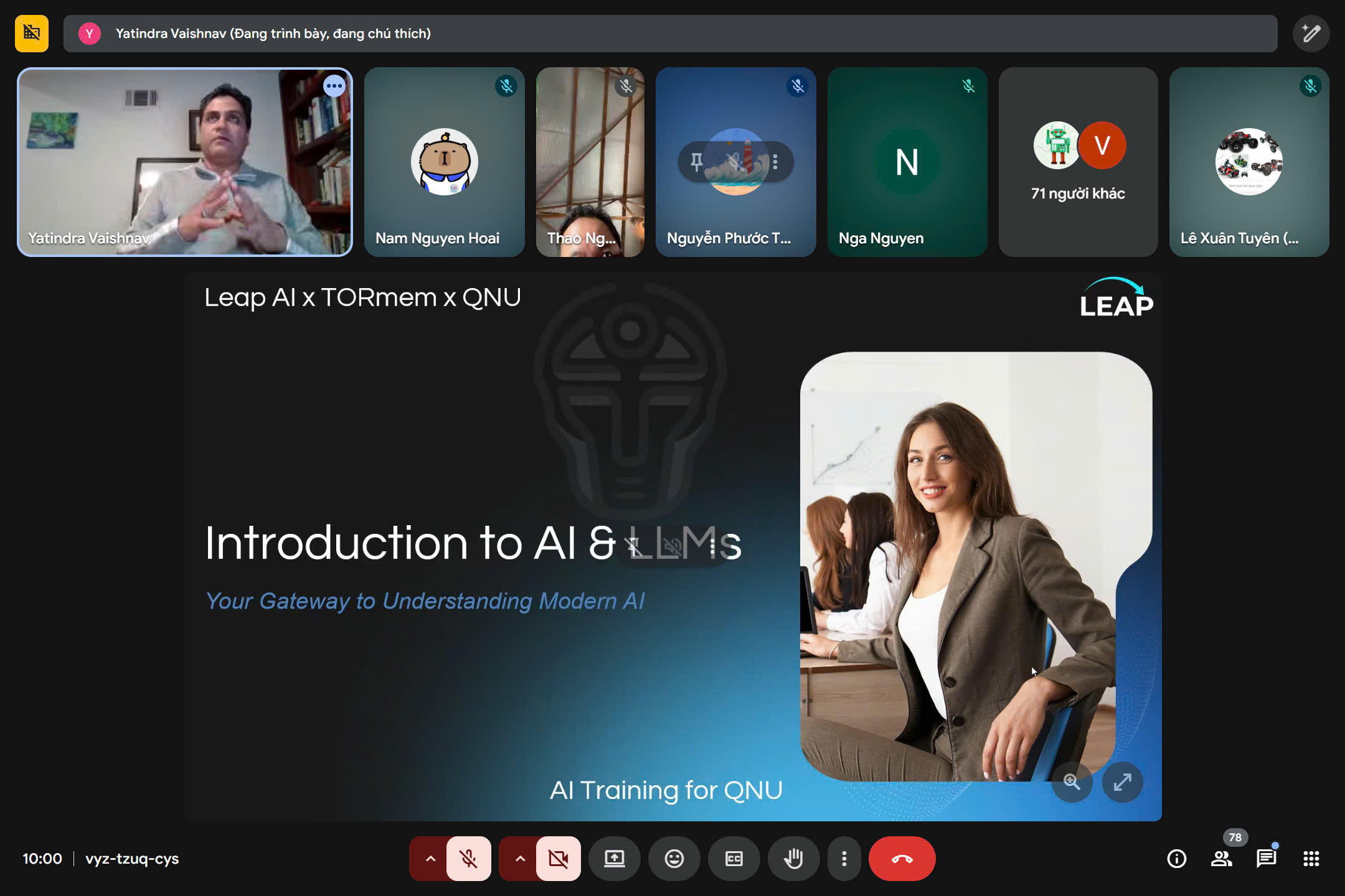 SHL - Vừa qua, TORmem (Hoa Kỳ) đã phối hợp cùng Leap AI và Trường Đại học Quy Nhơn (QNU) tổ chức thành công khóa đào tạo AI cơ bản, diễn ra đồng thời tại Silicon Valley, Gia Lai và TP. Hồ Chí Minh. Khóa học không chỉ cung cấp nền tảng kiến thức và kỹ năng thực hành về trí tuệ nhân tạo, mà còn đánh dấu bước tiến quan trọng trong việc hình thành năng lực công nghệ cho sinh viên và kỹ sư trẻ khu vực miền Trung.