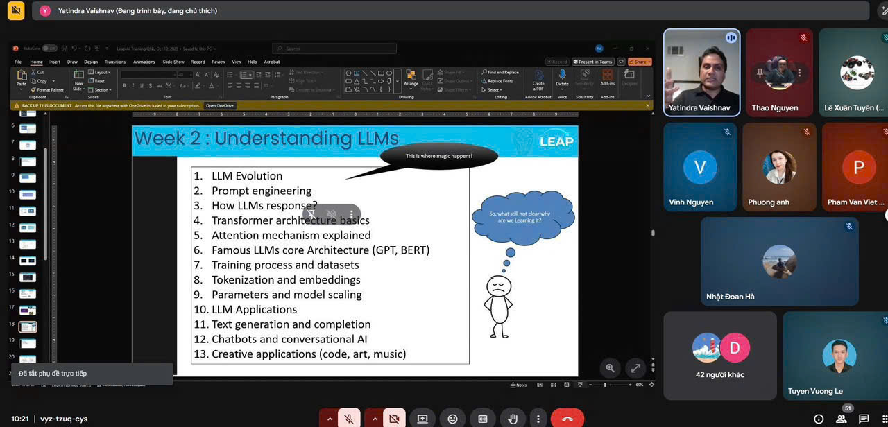 Trong 4 tuần liên tiếp, các buổi học được tổ chức đồng thời vào sáng thứ Bảy tại Việt Nam và tối thứ Sáu tại Hoa Kỳ, phản ánh tinh thần nỗ lực và cam kết mạnh mẽ của cả giảng viên lẫn sinh viên. Chương trình đào tạo chú trọng xây dựng nền tảng kiến thức AI vững chắc, kết hợp các tình huống thực tiễn cùng bài tập thực hành và định hướng phát triển lâu dài trong lĩnh vực AI và LLMs. Qua đó giúp học viên tiếp cận công nghệ một cách hệ thống, có khả năng ứng dụng trực tiếp vào thực tiễn công việc và đời sống.