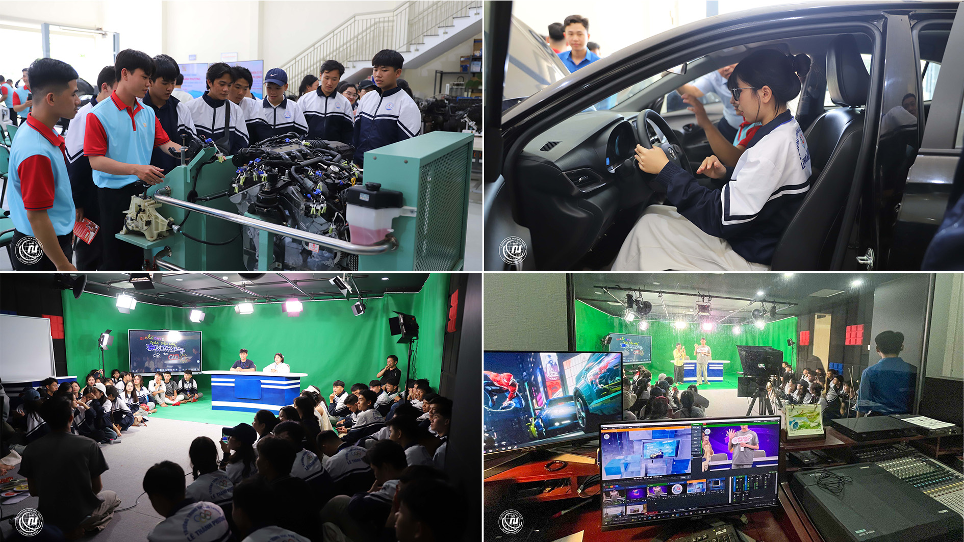 Điểm nhấn của chương trình là hoạt động tham quan, trải nghiệm thực tế tại Trung tâm thực hành ô tô và QNU Studio. Tại đây, học sinh được trực tiếp tiếp cận hệ thống hiện đại về truyền thông, công nghệ số; tìm hiểu các trang thiết bị phục vụ đào tạo, thực hành kỹ thuật. Tại QNU Studio, học sinh được tham quan không gian trường quay hiện đại, tìm hiểu các thiết bị ghi hình, thu âm, dựng phim và trực tiếp trải nghiệm vai trò biên tập viên, người dẫn bản tin. Hoạt động trải nghiệm thực tế đã mang lại nhiều hứng thú, giúp học sinh hiểu rõ hơn về môi trường học tập năng động, sáng tạo tại Trường Đại học Quy Nhơn.