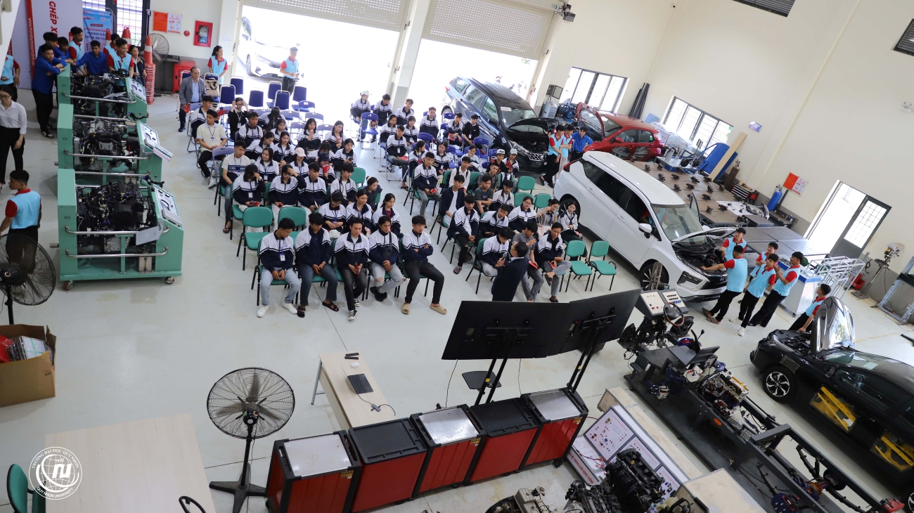 Các bạn học sinh hào hứng trải nghiệm tại Trung tâm thực hành ô tô, QNU Studio.