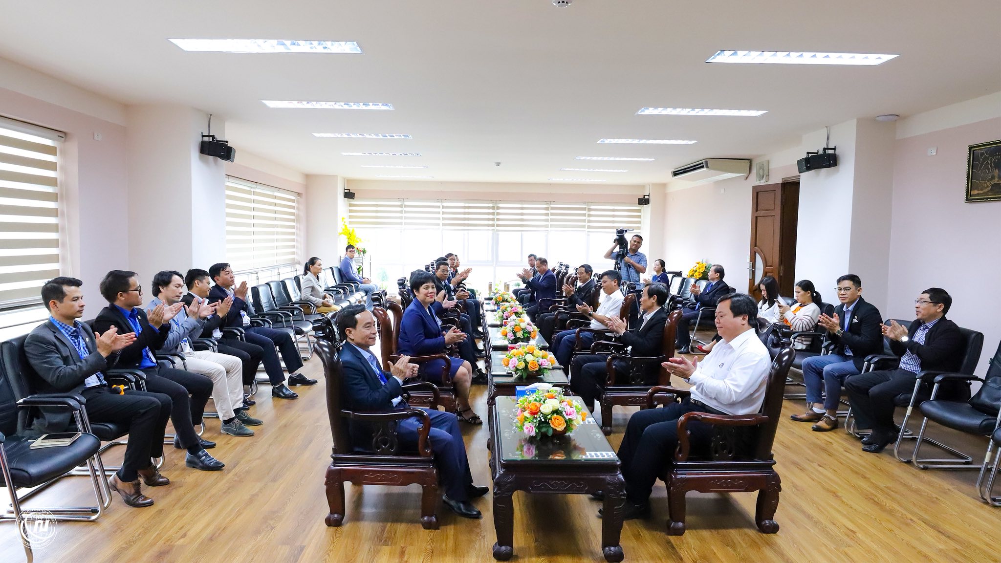 Phó Chủ tịch UBND tỉnh Lâm Hải Giang (bên trái) và PGS.TS. Đoàn Đức Tùng - Hiệu trưởng, trao đổi thân tình tại buổi gặp mặt chúc Tết.