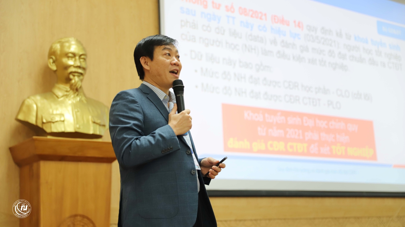 Phát biểu tại buổi tập huấn, TS. Đinh Anh Tuấn – Phó Hiệu trưởng Nhà trường nhấn mạnh tầm quan trọng của công tác bảo đảm chất lượng trong xây dựng và vận hành CTĐT. Phó Hiệu trưởng khẳng định, việc đánh giá mức độ người học đạt được các CĐR của học phần và CTĐT là yếu tố then chốt, giúp các khoa và Nhà trường rà soát, cập nhật, cải tiến chất lượng CTĐT, đáp ứng yêu cầu của thị trường lao động.