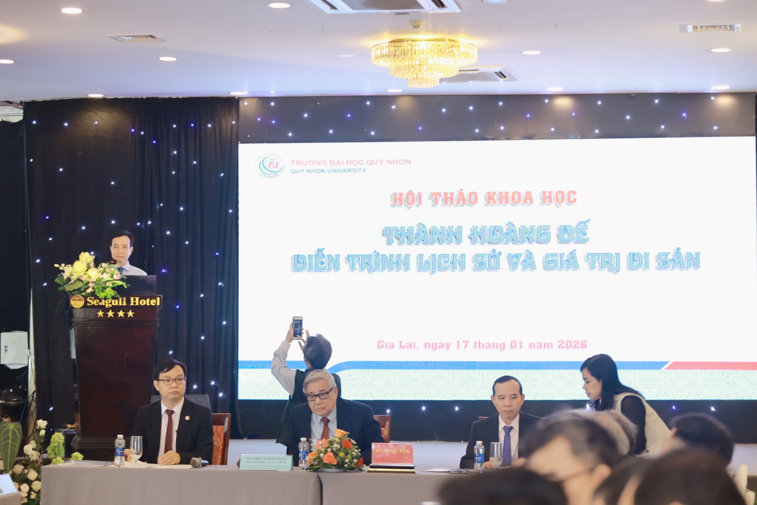 (KHXH&NV) – Thực hiện nhiệm vụ khoa học và công nghệ cấp quốc gia, ngày 17/01/2026, Trường Đại học Quy Nhơn tổ chức Hội thảo khoa học “Thành Hoàng Đế - Diễn trình lịch sử và giá trị di sản” nhằm tạo diễn đàn trao đổi học thuật, tập hợp các kết quả nghiên cứu mới về Thành Hoàng Đế. Hội thảo hướng tới làm rõ những giá trị lịch sử, văn hóa của di tích Thành Hoàng Đế trong tiến trình lịch sử Việt Nam, đồng thời cung cấp luận cứ khoa học cho công tác bảo tồn và phát huy giá trị di sản trong thời gian tới.