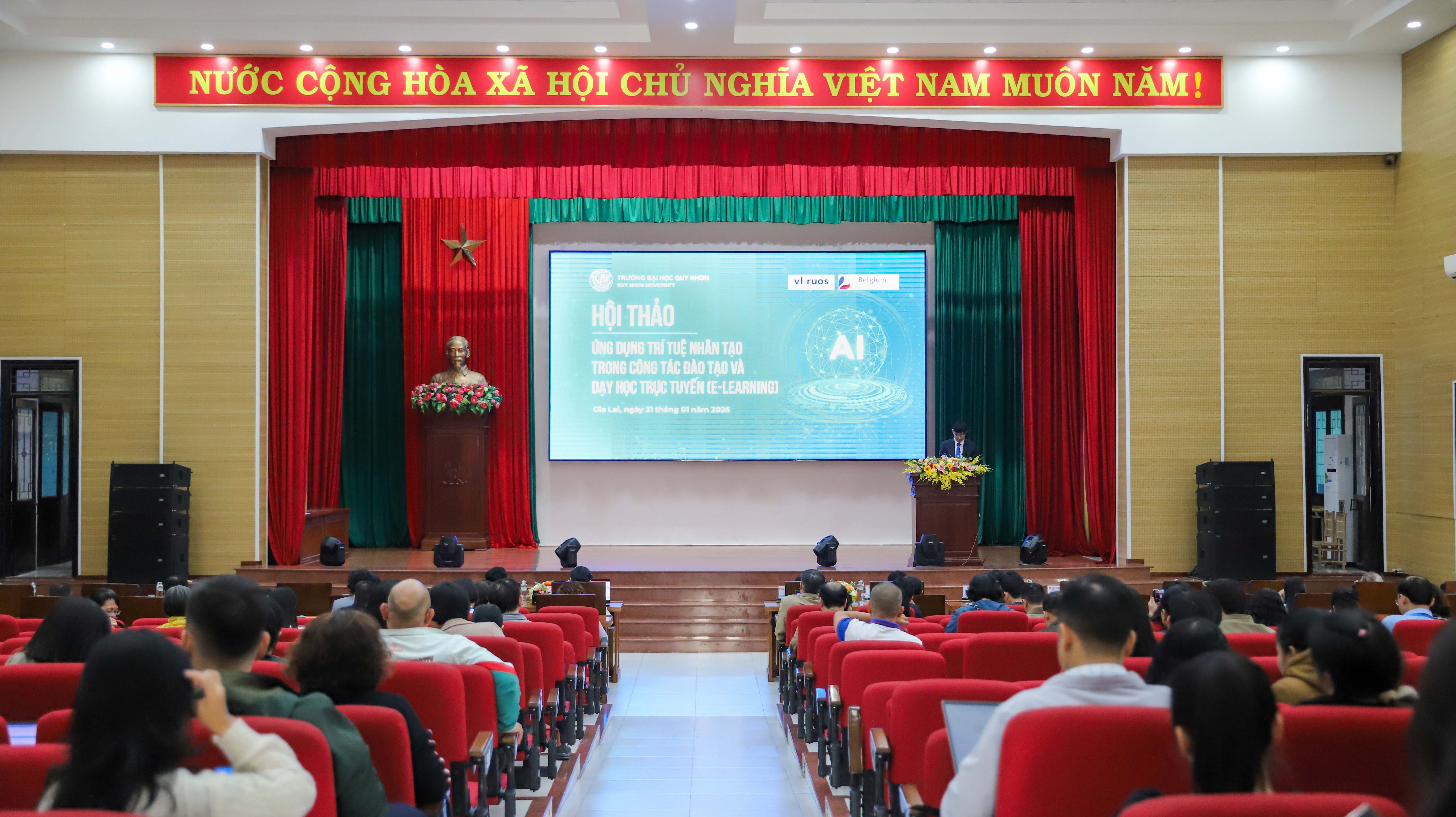 (SHL) – Chuyển đổi số đang trở thành xu thế tất yếu của giáo dục đại học. Nắm bắt xu hướng này, Trường Đại học Quy Nhơn từng bước đẩy mạnh ứng dụng các công nghệ hiện đại vào hoạt động đào tạo và nghiên cứu khoa học. Thực hiện định hướng phát triển giai đoạn 2025–2030, ngày 31/01/2026, Nhà trường tổ chức Hội thảo khoa học với chủ đề “Ứng dụng Trí tuệ nhân tạo (AI) trong công tác đào tạo và dạy học trực tuyến (E-learning)”. Hội thảo không chỉ là diễn đàn học thuật để các chuyên gia, giảng viên trao đổi và chia sẻ kinh nghiệm, mà còn thể hiện rõ quyết tâm của QNU trong việc nâng cao chất lượng đào tạo, đáp ứng yêu cầu đổi mới giáo dục trong kỷ nguyên số.