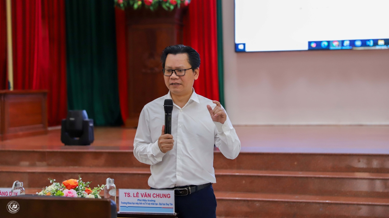 Tại chương trình, TS. Lê Văn Chung - Phó Hiệu trưởng Trường Khoa học máy tính và Trí tuệ nhân tạo cùng ThS. Đoàn Hoàng Duy - Trưởng phòng Tổng hợp Trường Khoa học máy tính và Trí tuệ nhân tạo, Phó Trưởng khoa Khoa Công nghệ thông tin, Đại học Duy Tân đã mang đến nhiều nội dung chuyên sâu, thiết thực thông qua các báo cáo chuyên đề. Các tham luận tập trung làm rõ những vấn đề cốt lõi như quy trình thiết kế và triển khai ứng dụng AI, xây dựng hệ sinh thái AI trong giáo dục, cũng như phương thức tích hợp công nghệ vào hoạt động nghiên cứu khoa học và quản lý đào tạo.
