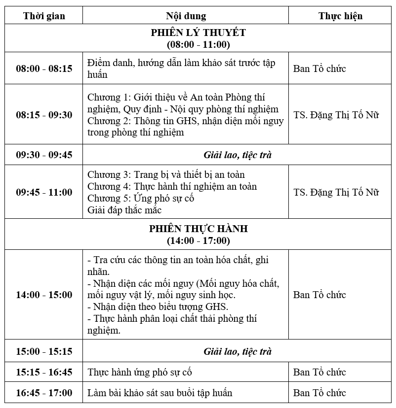 - Nâng cao nhận thức cho sinh viên về các mối nguy có thể xảy ra trong quá trình học tập và nghiên cứu tại phòng thí nghiệm. Trang bị cho sinh viên kiến thức và kỹ năng sử dụng an toàn các thiết bị, dụng cụ và hóa chất trong phòng thí nghiệm;