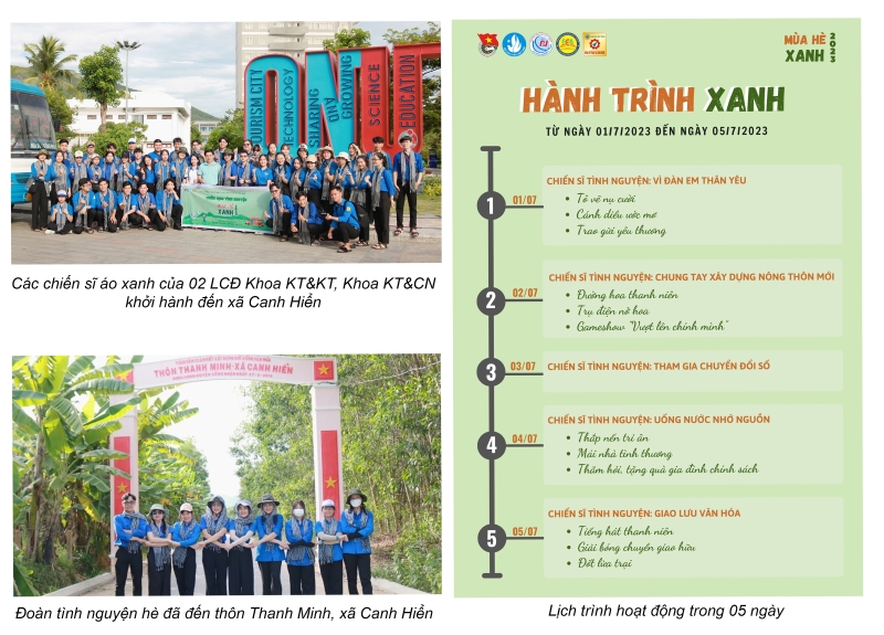 Mùa hè xanh năm 2023, hơn 50 sinh viên là các “Chiến sĩ áo xanh tình nguyện” của Liên Chi đoàn (LCĐ) Khoa Kinh tế & Kế toán (KT&KT ) và Liên Chi đoàn Khoa Kỹ thuật & Công nghệ (KT&CN) xuất phát đến xã Canh Hiển, huyện Vân Canh, tỉnh Bình Định, bắt đầu hành trình tình nguyện 05 ngày từ ngày 01/7/2023 đến ngày 05/7/2023.