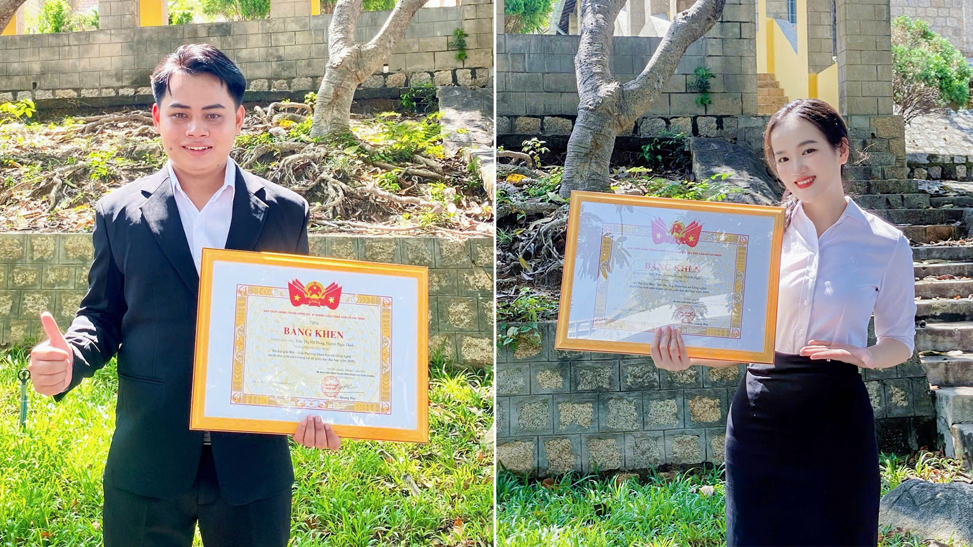 Sinh viên Huỳnh Ngọc Danh và sinh viên Trần Thị Mỹ Dung (Khoa Lý luận chính trị, Luật và Quản lý nhà nước) nhận Bằng khen của BCH Trung ương Đoàn TNCS Hồ Chí Minh.