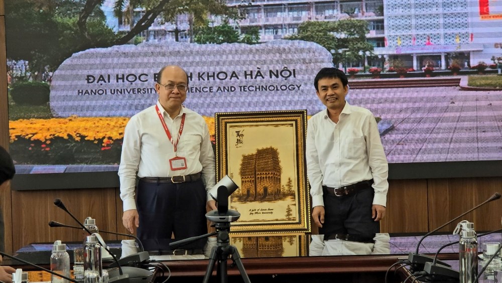 Kết thúc buổi làm việc, Đoàn công tác Trường Đại học Quy Nhơn đã trao tặng Đại học Bách Khoa Hà Nội bức tranh Tháp Đôi, di tích văn hóa – lịch sử tiêu biểu của Tp. Quy Nhơn. Đây là ấn phẩm được vẽ bằng nghệ thuật bút lửa trên chất liệu gỗ như một lời cảm ơn sâu sắc về sự đón tiếp chu đáo và hợp tác từ Đại học Bách Khoa Hà Nội. Đáp lại, Đại học Bách Khoa Hà Nội đã tặng quà lưu niệm và bày tỏ lòng cảm kích trước món quà ý nghĩa và ghi nhận những chia sẻ thực tiễn mà đoàn Trường Đại học Quy Nhơn mang đến. Sự kết nối giữa hai trường hứa hẹn sẽ mở ra nhiều cơ hội hợp tác trong tương lai.