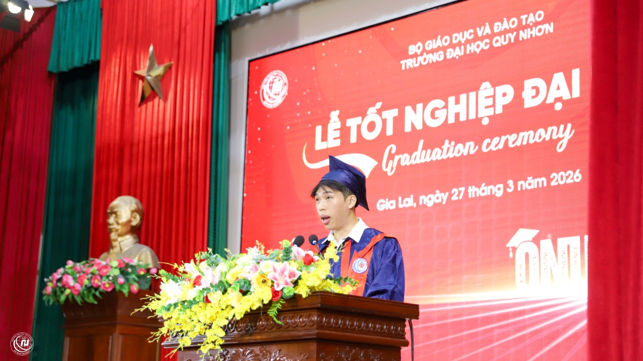 Đại diện sinh viên tốt nghiệp, Trần Lê Minh Trưởng - tân kỹ sư đã phát biểu bày tỏ lòng tri ân sâu sắc đến Ban Giám hiệu, thầy cô và gia đình. Những kỷ niệm giảng đường cùng nỗ lực vượt khó để chinh phục tri thức được chia sẻ chân thành, góp phần làm nổi bật ý nghĩa của buổi lễ và khép lại quãng thời gian sinh viên đầy dấu ấn.