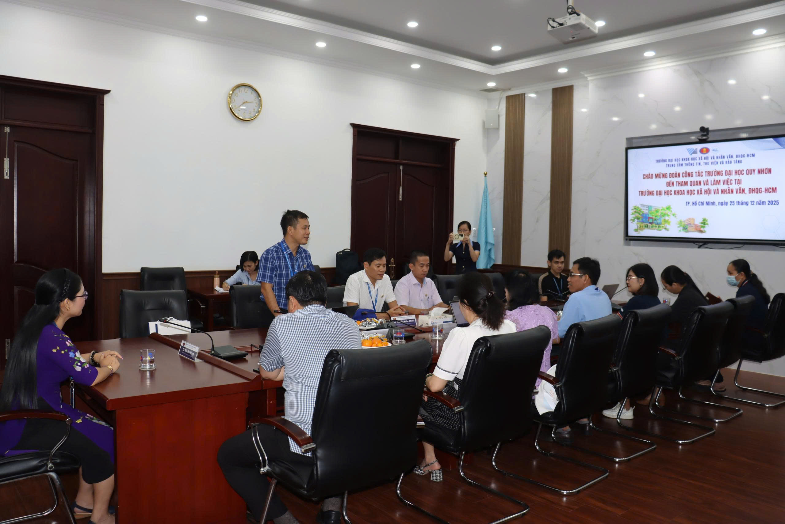 Buổi làm việc diễn ra trong không khí cởi mở, thẳng thắn, với sự tham dự của đại diện lãnh đạo và cán bộ chuyên môn của Trường Đại học Khoa học Xã hội và Nhân văn, gồm Ban Giám đốc Trung tâm Thông tin, Thư viện & Bảo tàng (CILM), Trung tâm Tin học, Phòng Công tác Sinh viên, Phòng Quản lý Đào tạo, Phòng Đối ngoại và Quản lý Khoa học. Hai bên cùng chia sẻ kinh nghiệm, mô hình triển khai và những vấn đề thực tiễn trong quá trình phát triển hệ thống thư viện hiện đại, e-learning và các dịch vụ số phục vụ người học.