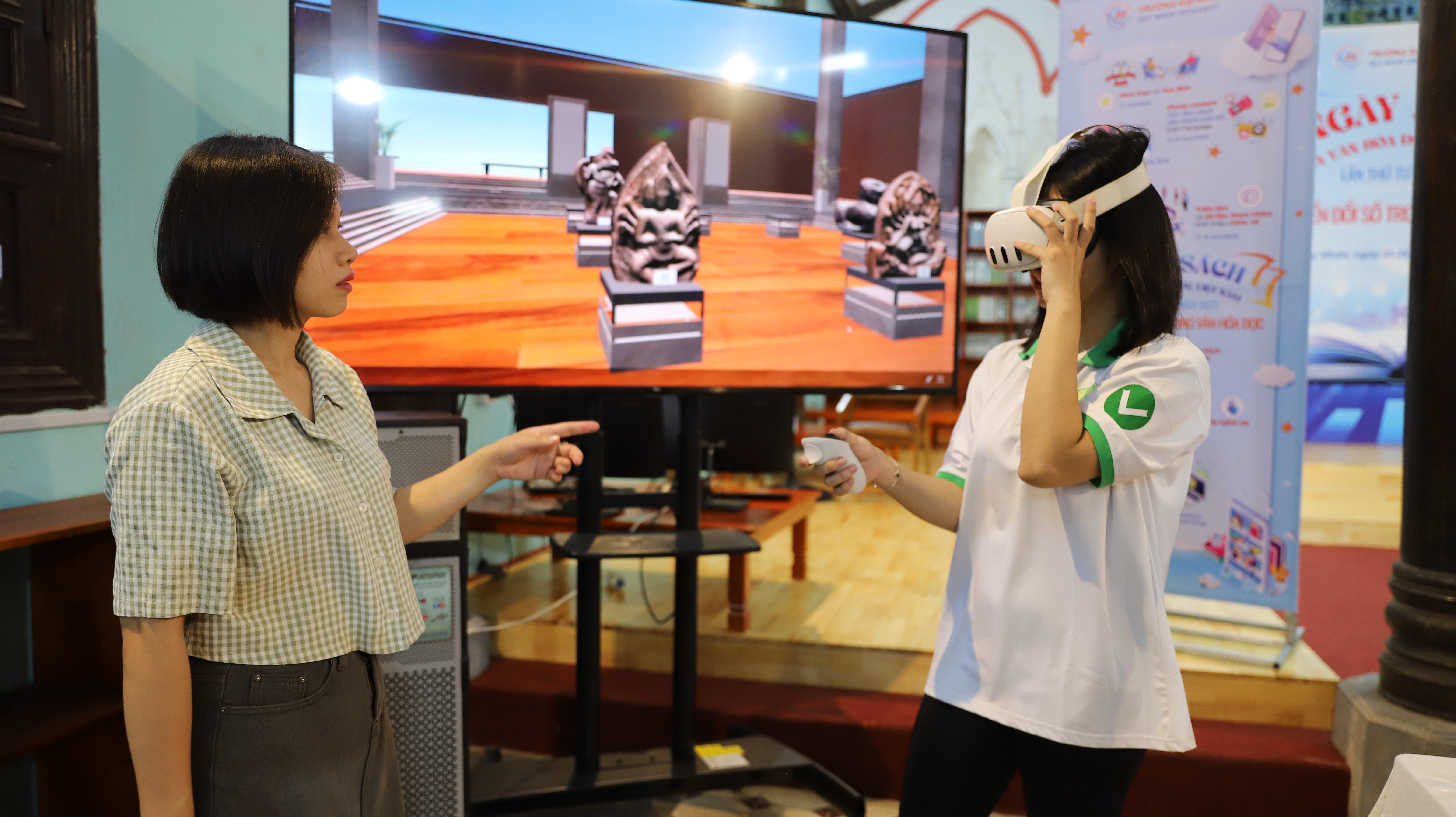 Sinh viên QNU trải nghiệm công nghệ VR về trưng bày bảo tàng ảo.