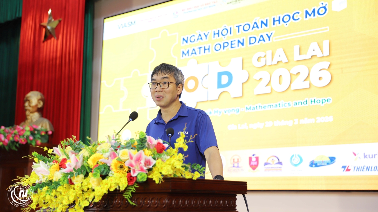 Phát biểu tại chương trình, TS. Đinh Anh Tuấn – Phó Hiệu trưởng Trường Đại học Quy Nhơn nhấn mạnh, Nhà trường vinh dự đồng hành cùng Viện Nghiên cứu cao cấp về Toán và Sở Giáo dục và Đào tạo Gia Lai tổ chức sự kiện với chủ đề “Toán học và Hy vọng”. Đây là lần thứ ba Ngày hội Toán học mở được tổ chức tại Quy Nhơn, khẳng định sức sống bền bỉ của một hoạt động học thuật giàu ý nghĩa cộng đồng, góp phần kết nối các nhà khoa học, giáo viên, học sinh, sinh viên và những người yêu Toán học.