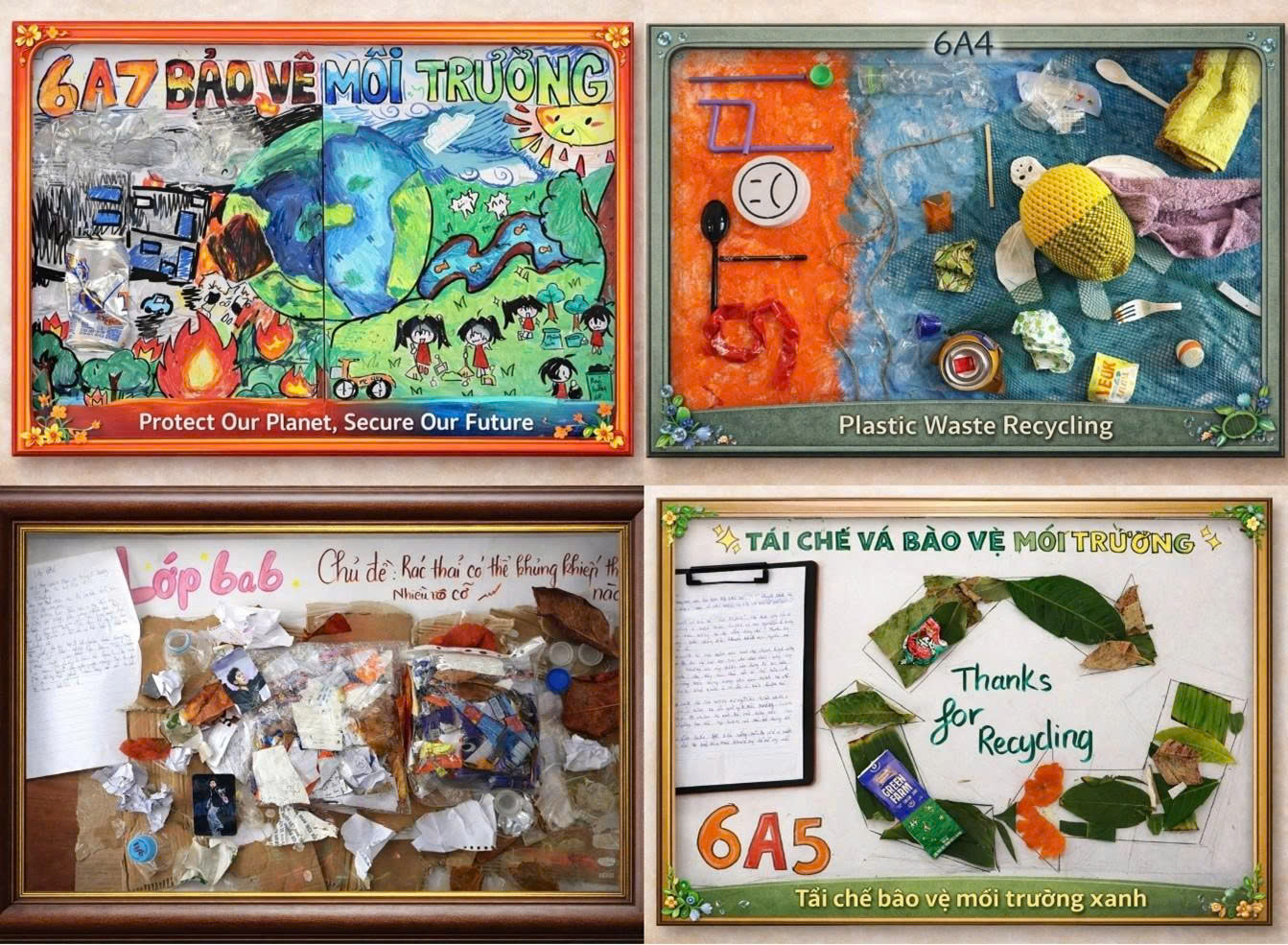 Các sản phẩm sáng tạo từ vật liệu tái chế của học sinh, lan tỏa thông điệp bảo vệ môi trường và xây dựng lối sống xanh.