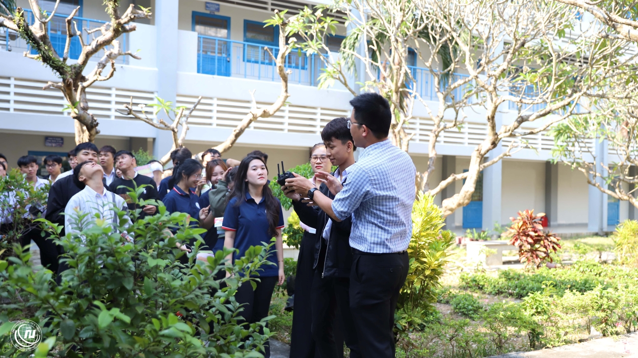 Các bạn học sinh trải nghiệm điều khiển thiết bị fly-cam tại khu thực hành, thí nghiệm A6-QNU