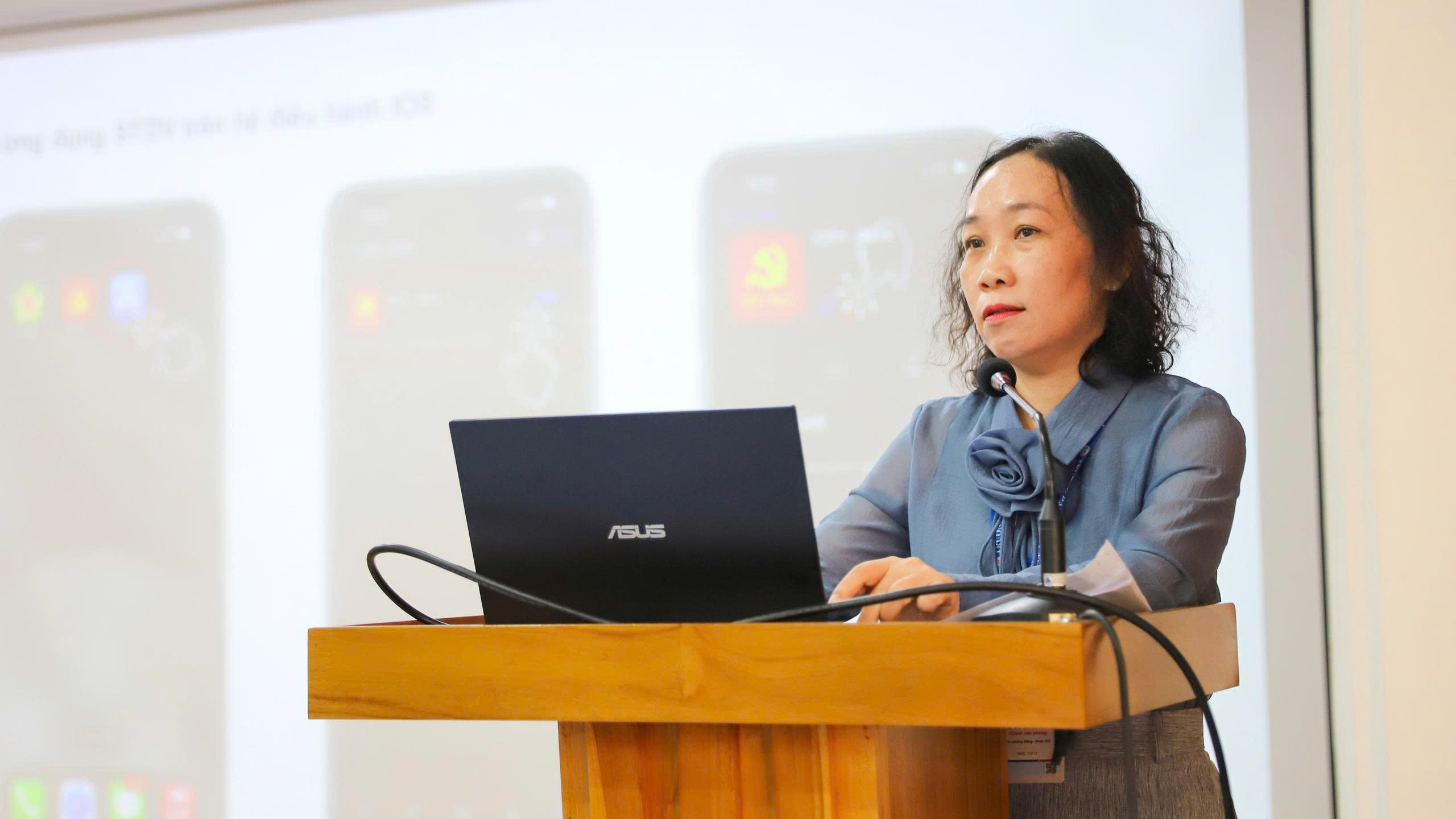 Đồng chí Vũ Thị Lê Hồng - Ủy viên Ban thường vụ, Chánh Văn phòng Đảng - Đoàn thể giới thiệu tổng quan về ứng dụng “Sổ tay đảng viên điện tử”.