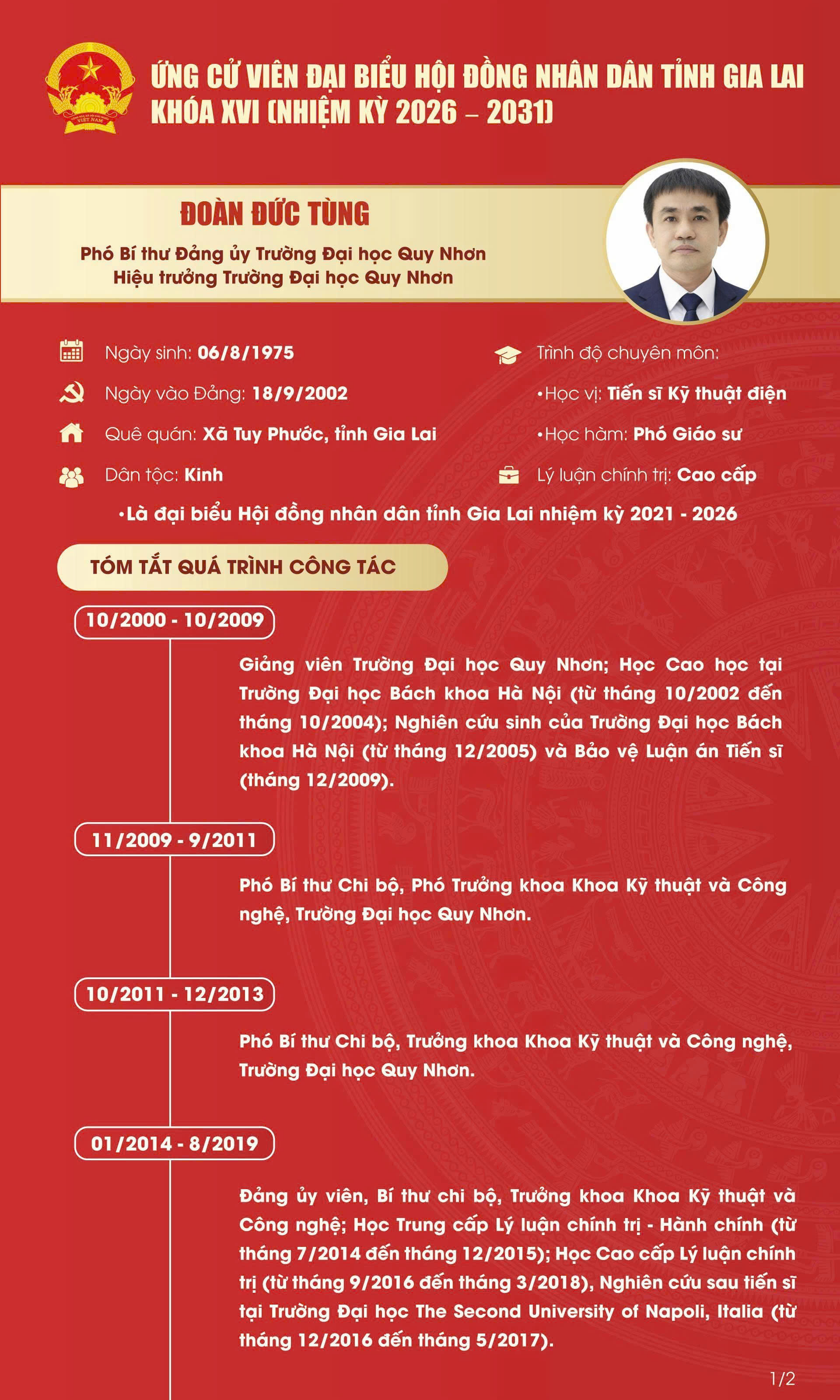 Theo danh sách được công bố, PGS.TS. Đoàn Đức Tùng - Hiệu trưởng Trường Đại học Quy Nhơn tham gia ứng cử đại biểu HĐND tỉnh Gia Lai khóa XIII, nhiệm kỳ 2026 - 2031 tại Đơn vị bầu cử số 4. Đơn vị bầu cử này gồm các xã: An Nhơn Tây, Tây Sơn, Bình Khê, Bình Phú, Bình Hiệp, Bình An, Vĩnh Thạnh, Vĩnh Thịnh, Vĩnh Quang và Vĩnh Sơn.