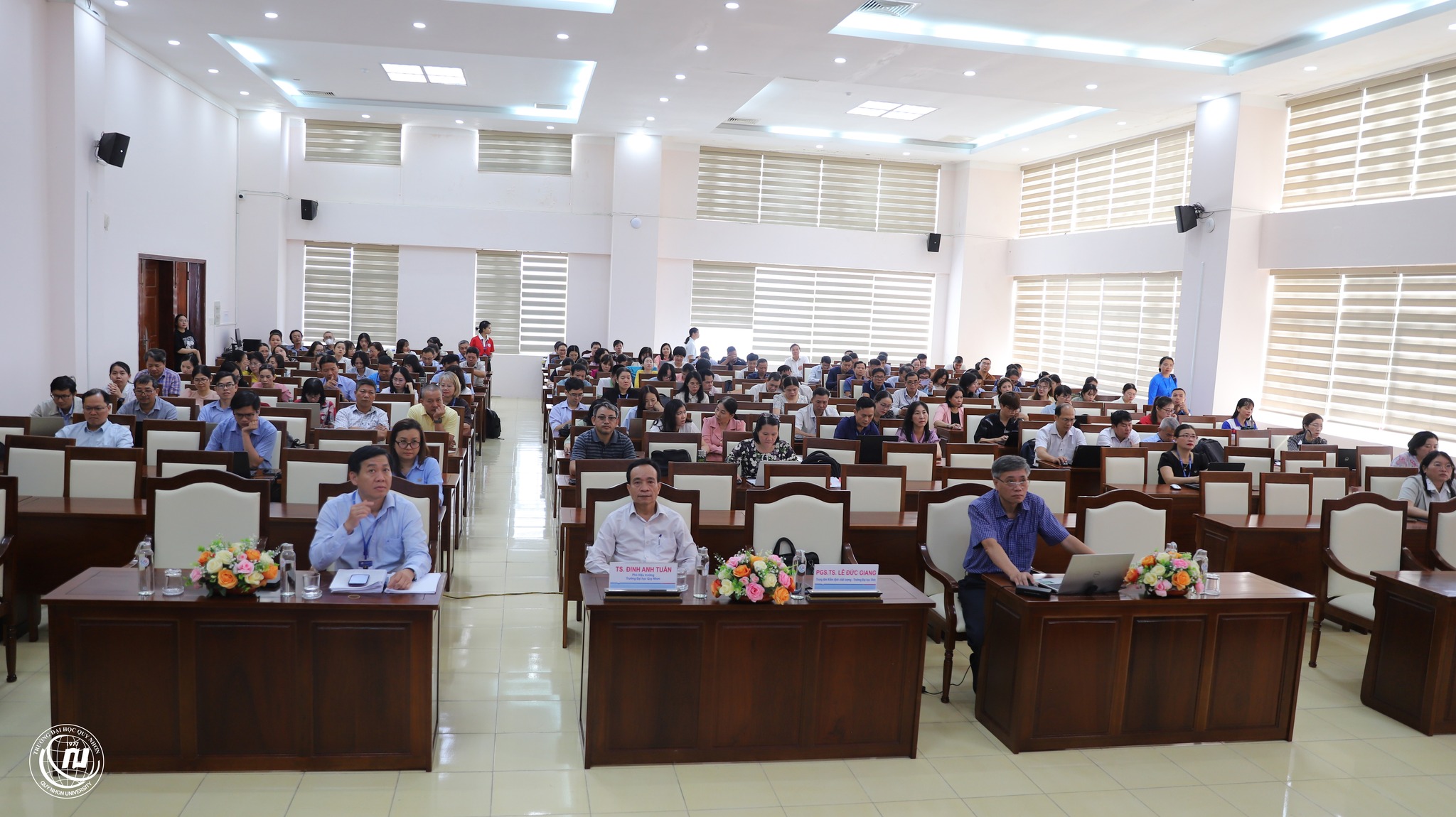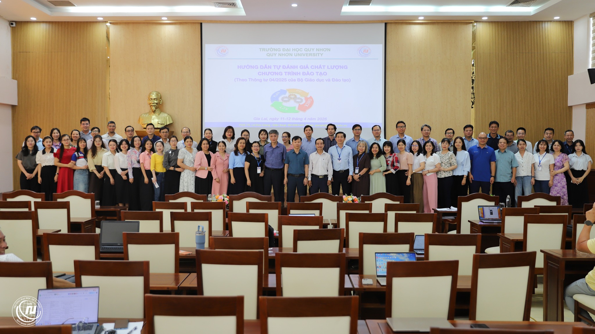 (KT&BĐCL) – Thực hiện kế hoạch tự đánh giá chương trình đào tạo (CTĐT) trình độ đại học của 12 ngành: Sư phạm Toán học, Sư phạm Hoá học, Sư phạm Lịch sử - Địa lý, Sư phạm Khoa học tự nhiên, Giáo dục Mầm non, Giáo dục Tiểu học, Giáo dục Thể chất, Ngôn ngữ Trung Quốc, Quản lý Giáo dục, Kỹ thuật Xây dựng, Công nghệ Kỹ thuật Hoá học, Quản lý Đất đai, ngày 11-12/4/2026, Trường Đại học Quy Nhơn phối hợp với Trung tâm Kiểm định chất lượng - Trường Đại học Vinh tổ chức Tập huấn công tác tự đánh giá CTĐT theo tiêu chuẩn của Bộ GD&ĐT (Thông tư 04/2025/TT-BGDĐT). Hội nghị tập huấn nhằm trang bị các nội dung liên quan đến chuyên môn, nghiệp vụ tự đánh giá (TĐG) và đánh giá ngoài CTĐT cho các thành viên Hội đồng TĐG, Ban thư ký và các nhóm công tác chuyên trách.