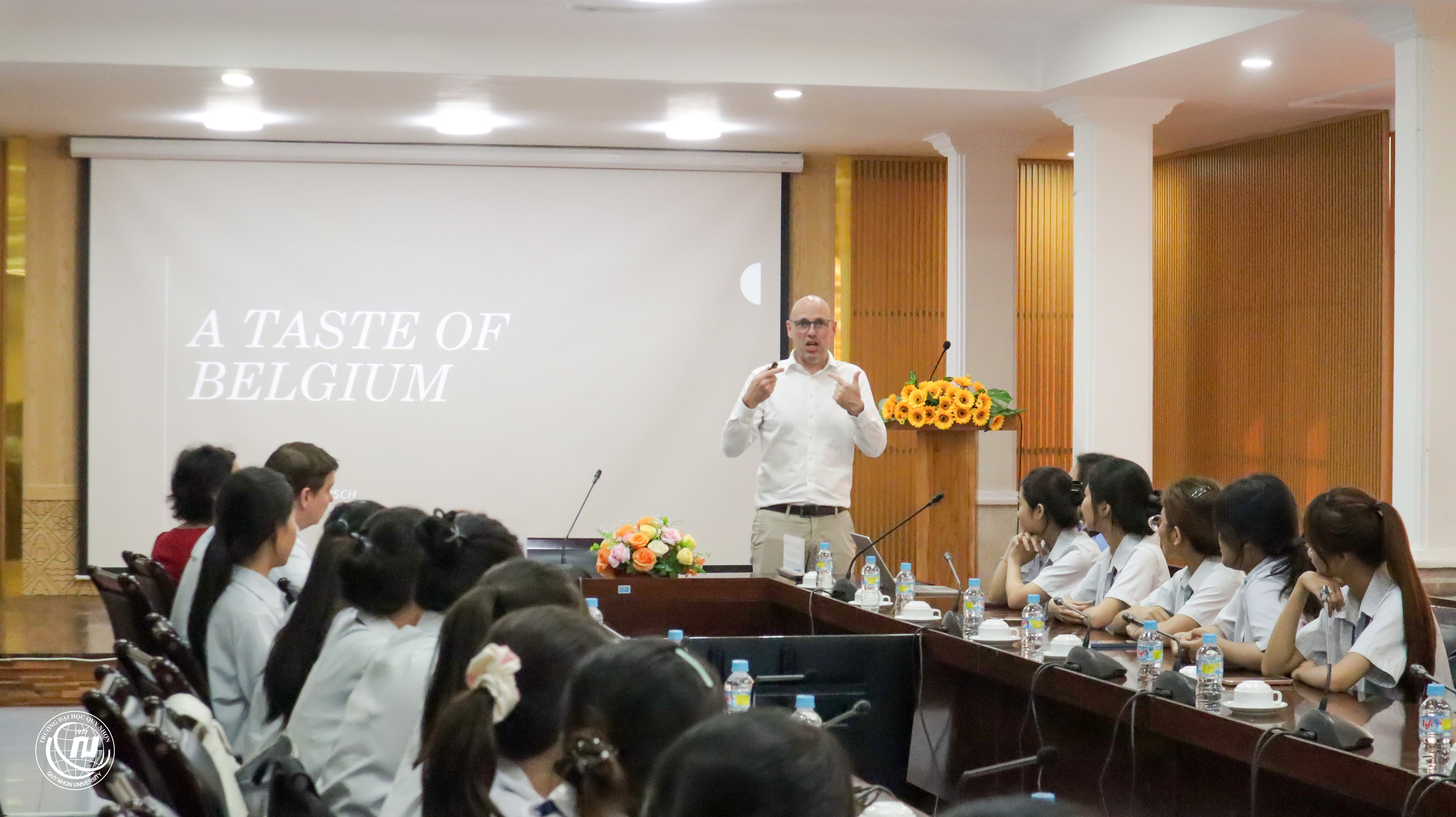 Các bạn sinh viên lắng nghe TS. Lode Vanwildemeersch - Đại học Khoa học ứng dụng VIVES giới thiệu về chuyên đề trải nghiệm văn hóa “Câu chuyện về socola và bia Bỉ”
