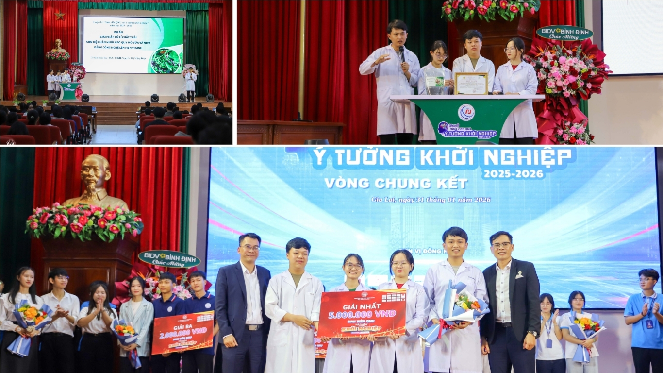 Dự án Giải pháp xử lý chất thải cho hộ chăn nuôi heo quy mô vừa và nhỏ bằng công nghệ lên men vi sinh xuất sắc đạt Giải Nhất tại Cuộc thi “Sinh viên QNU với ý tưởng khởi nghiệp” năm học 2025 - 2026.