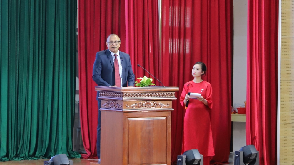 Assoc.Prof.Dr. Do Ngoc My, Rector of QNU, speaks at the event