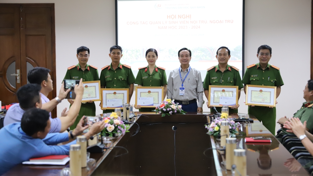Nhân dịp này, Nhà trường đã trao giấy khen và thưởng cho công an các phường: Phường Nguyễn Văn Cừ, Phường Ngô Mây, Phường Quang Trung, Phường Ghềnh Ráng, Phường Trần Phú (TP. Quy Nhơn) vì đã có thành tích xuất sắc trong công tác phối hợp với Trường Đại học Quy Nhơn về quản lý sinh viên nội trú, ngoại trú của năm học 2023 – 2024.