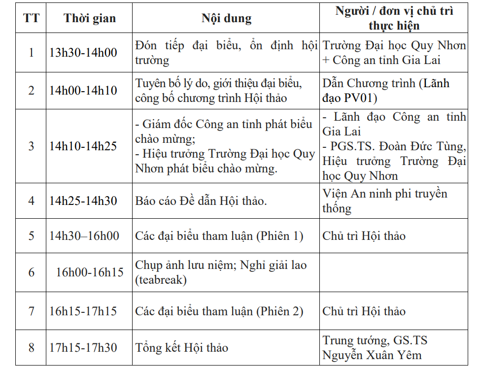 Căn cứ các Công văn số 2773 và 2774/ĐHQN-KHCNHTQT ngày 22/9/2025 của Hiệu trưởng Trường Đại học Quy Nhơn về việc phối hợp với Viện An ninh phi truyền thống, Trường Quản trị và Kinh doanh - Đại học quốc gia Hà Nội và Công an tỉnh Gia Lai tổ chức Hội thảo khoa học “Tham vấn về xây dựng các phương án phòng ngừa, ứng phó, bảo đảm an ninh môi trường biển của tỉnh Gia Lai”;