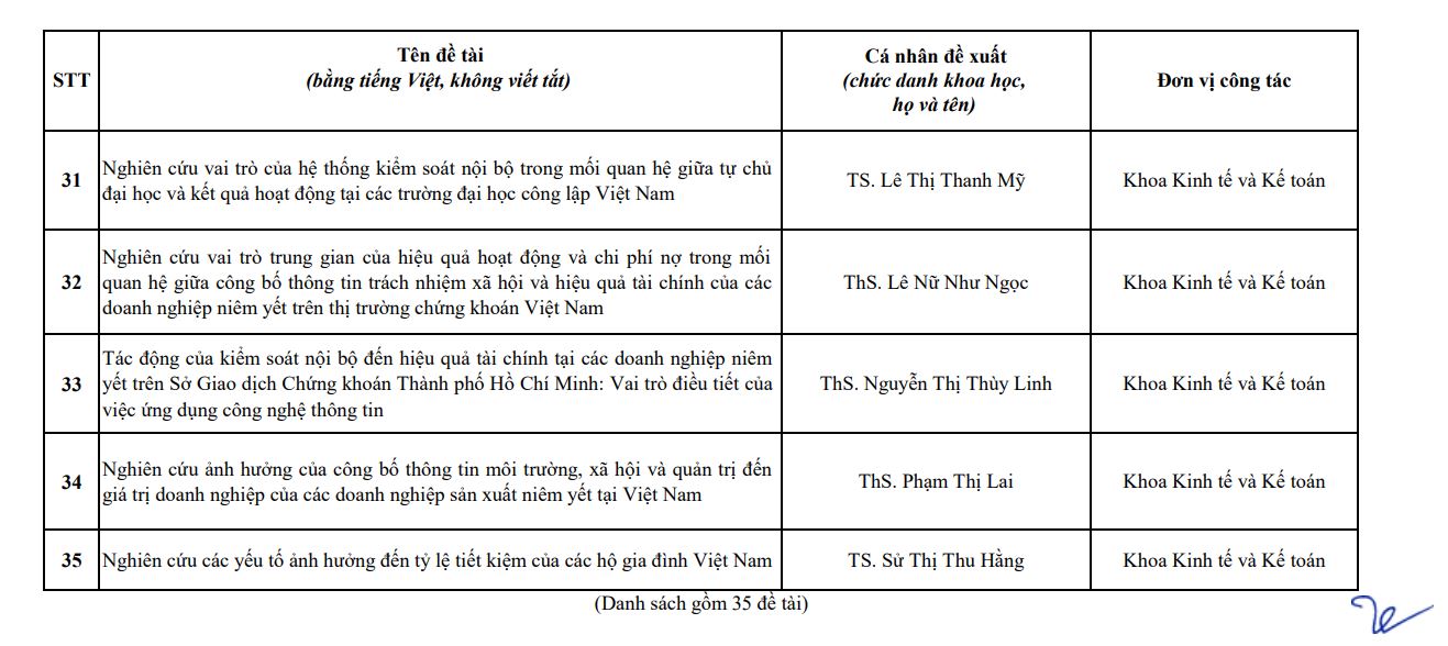 Điều 1. Phê duyệt danh mục gồm 35 đề tài khoa học và công nghệ cấp Trường được đưa vào kế hoạch thực hiện trong năm 2026 (có danh mục đề tài kèm theo).