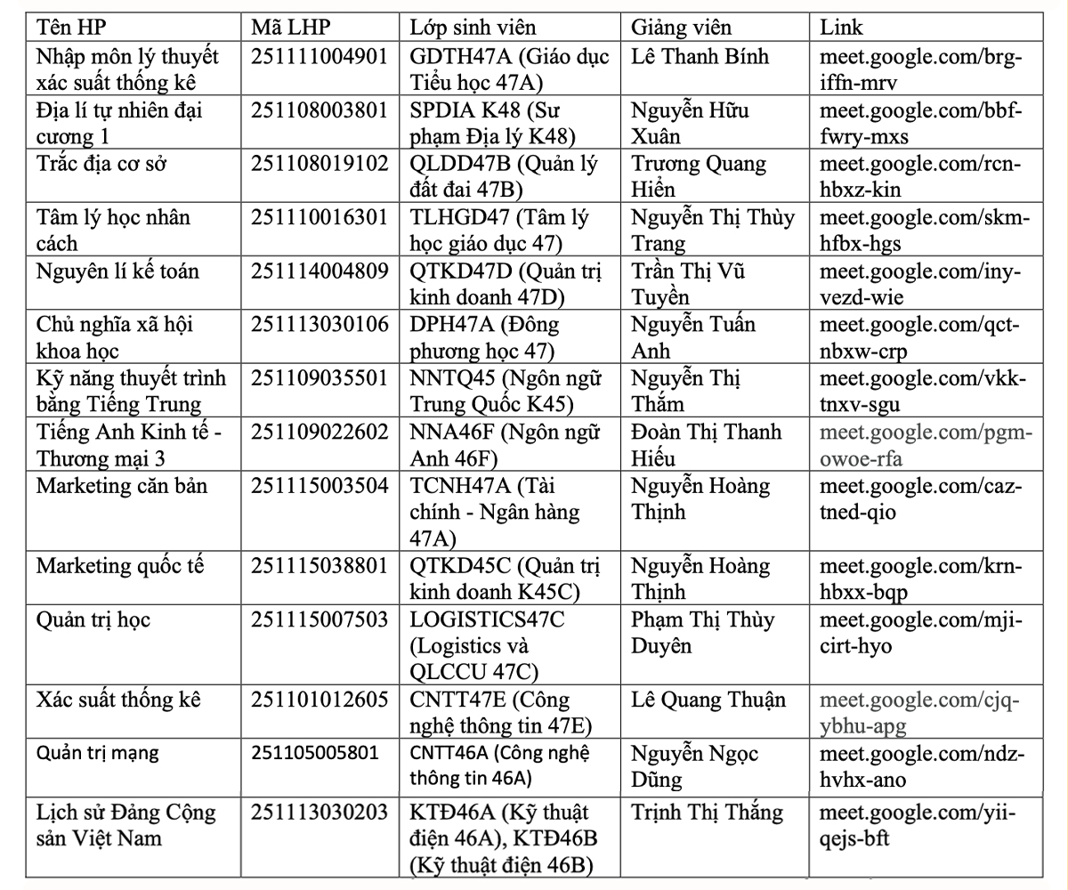 3. Ngoài ra, 14 lớp học phần sau đây dạy và học online qua Google Meet: