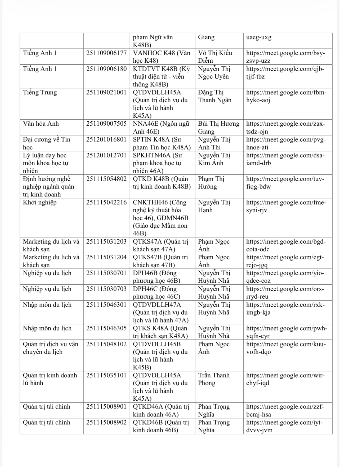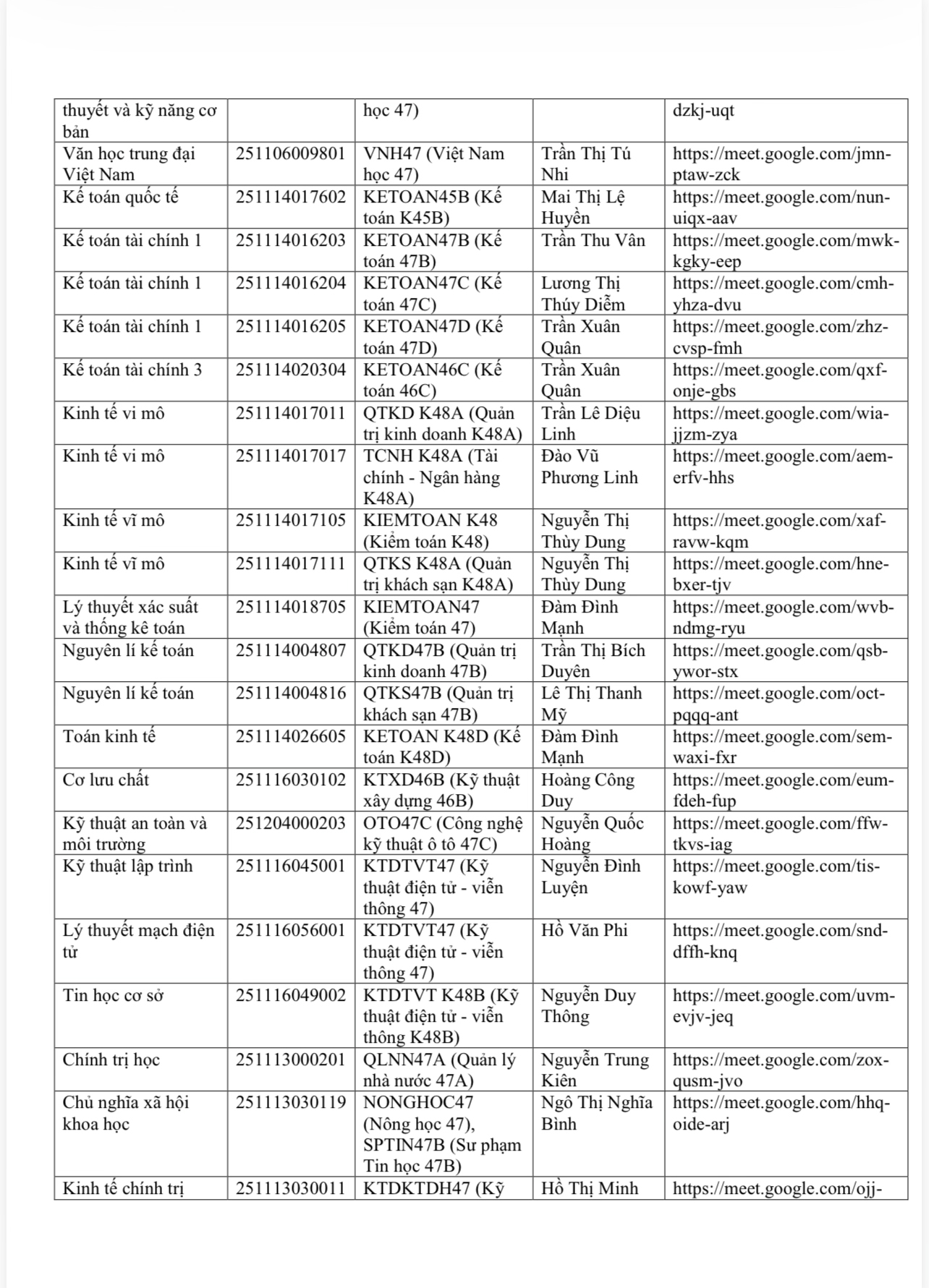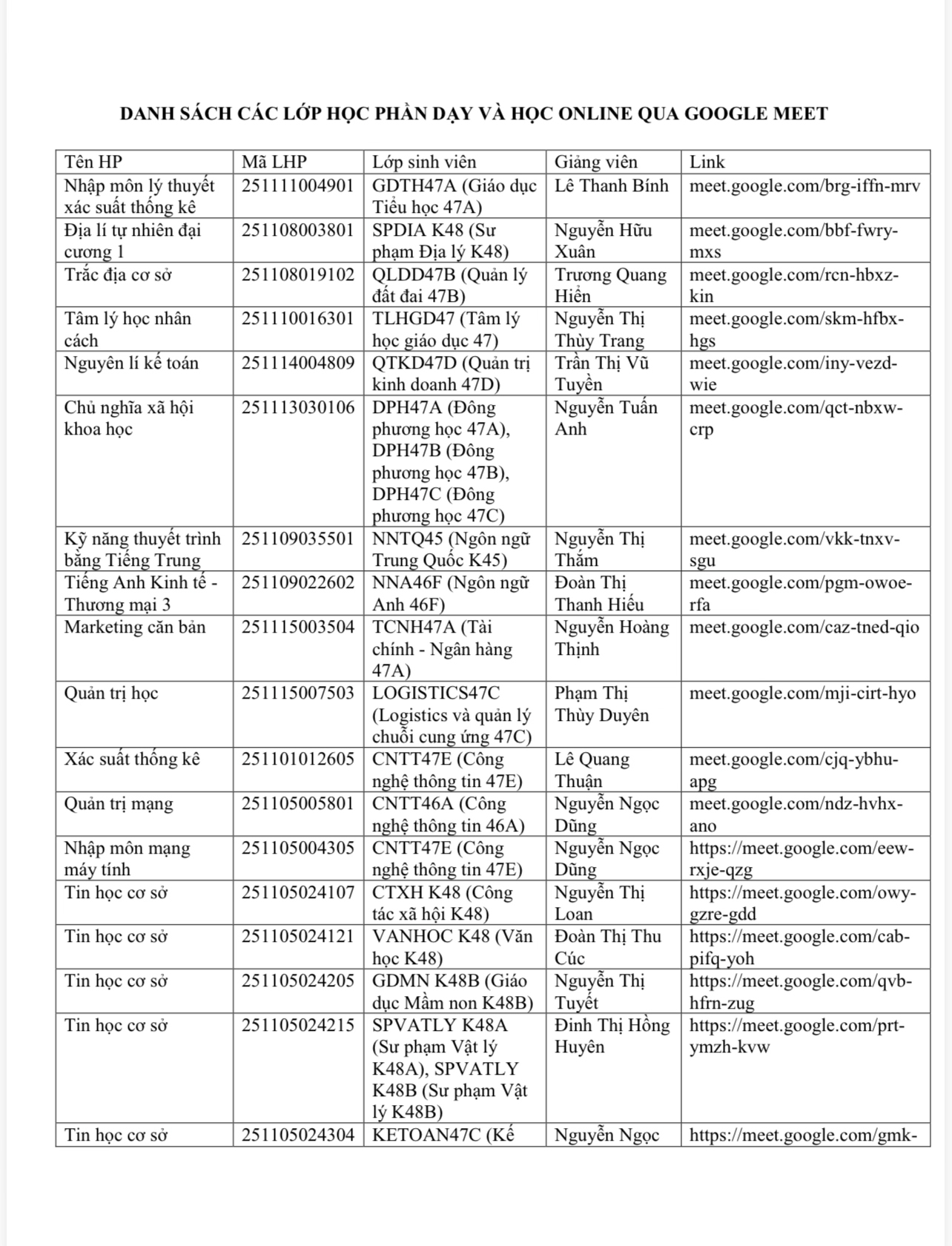 3. Ngoài ra, các lớp học phần (151 lớp) học tại các phòng A3 - 301, 302, 305, 306, 307 và A8 - 52, 53 dạy và học online qua Google Meet (Danh sách đính kèm).